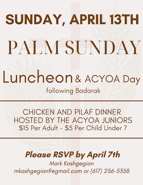With the support of Mark Kashgegian, the ACYOA Jrs will once again host a Palm Sunday luncheon. More details to follow.